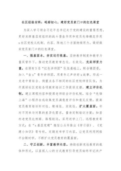 / 【七哥公文】2024年:社区经验材料:砥砺初心,建好党员家门口的红色课堂+更多免费公文+VX:QiGeGongWen2024
