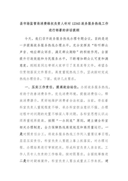 【七哥公文】2024年:县市场监管局消费维权负责人针对12345政务服务热线工作进行部署的讲话提纲+更多免费公文+VX:QiGeGongWen2024