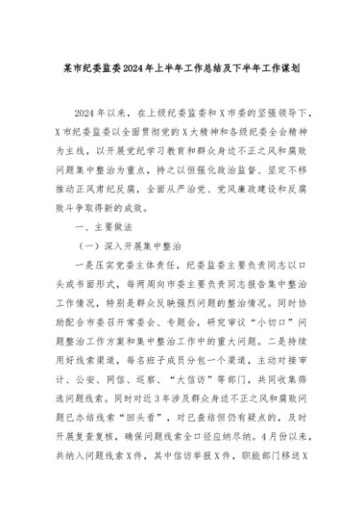 【七哥公文】2024年:某市纪委监委2024年上半年工作总结及下半年工作谋划+更多免费公文+VX:QiGeGongWen2024