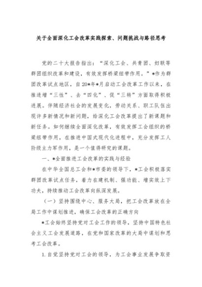 / 【七哥公文】2024年:关于全面深化工会改革实践探索、问题挑战与路径思考+更多免费公文+VX:QiGeGongWen2024