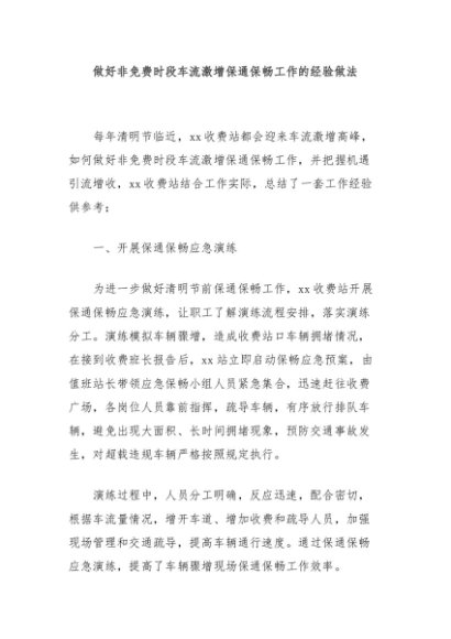 【七哥公文】2024年:做好非免费时段车流激增保通保畅工作的经验做法+更多免费公文+VX:QiGeGongWen2024