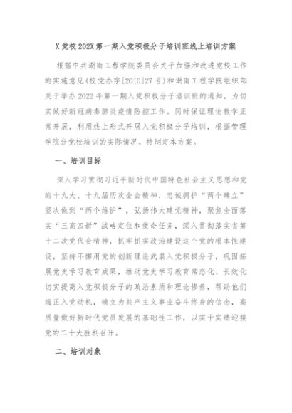 【七哥公文】2024年:X党校202X第一期入党积极分子培训班线上培训方案+更多免费公文+VX:QiGeGongWen2024