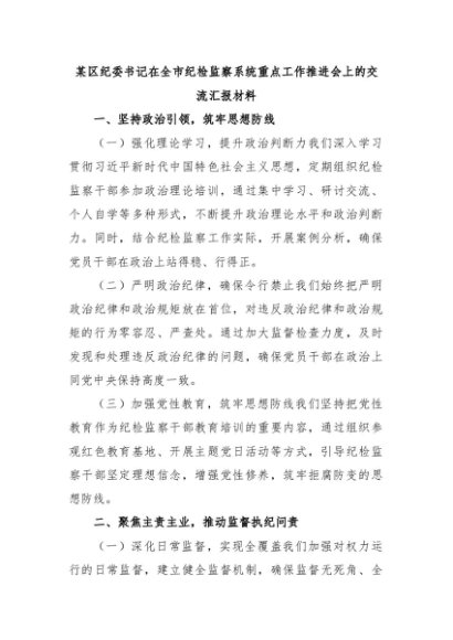 【七哥公文】2024年:某区纪委书记在全市纪检监察系统重点工作推进会上的交流汇报材料+更多免费公文+VX:QiGeGongWen2024