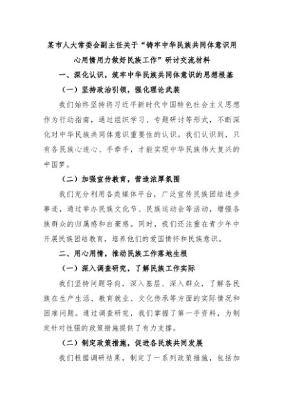 【七哥公文】2024年:某市人大常委会副主任关于“铸牢中华民族共同体意识用心用情用力做好民族工作”研讨交流材料+更多免费公文+VX:QiGeGongWen2024