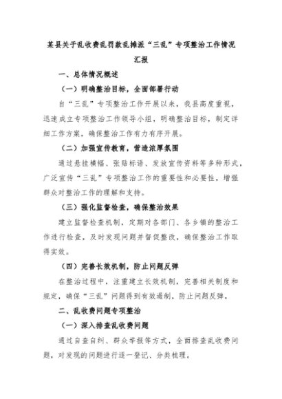 【七哥公文】2024年:某县关于乱收费乱罚款乱摊派“三乱”专项整治工作情况汇报+更多免费公文+VX:QiGeGongWen2024