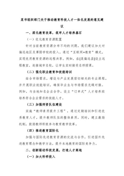 【七哥公文】2024年:某市组织部门关于推动教育科技人才一体化发展的意见建议+更多免费公文+VX:QiGeGongWen2024