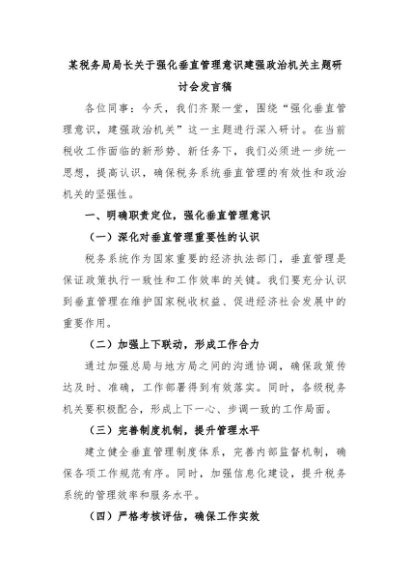 【七哥公文】2024年:某税务局局长关于强化垂直管理意识建强政治机关主题研讨会发言稿+更多免费公文+VX:QiGeGongWen2024