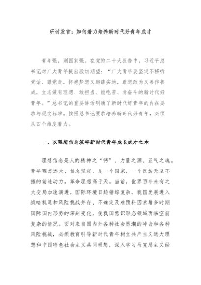 【七哥公文】2024年:研讨发言:如何着力培养新时代好青年成才+更多免费公文+VX:QiGeGongWen2024