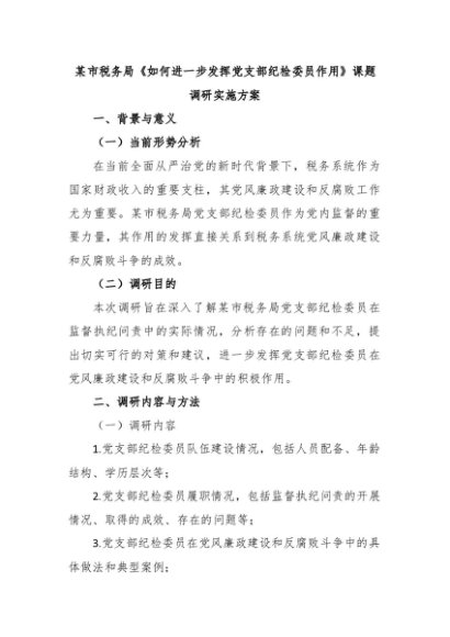 【七哥公文】2024年:某市税务局《如何进一步发挥党支部纪检委员作用》课题调研实施方案+更多免费公文+VX:QiGeGongWen2024