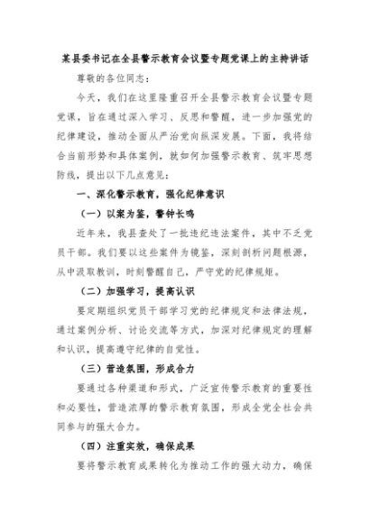 【七哥公文】2024年:某县委书记在全县警示教育会议暨专题党课上的主持讲话+更多免费公文+VX:QiGeGongWen2024