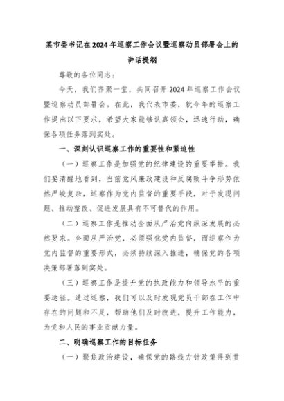 【七哥公文】2024年:某市委书记在2024年巡察工作会议暨巡察动员部署会上的讲话提纲+更多免费公文+VX:QiGeGongWen2024