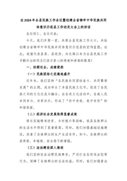 【七哥公文】2024年:在2024年全县民族工作会议暨创建全省铸牢中华民族共同体意识示范县工作动员大会上的讲话+更多免费公文+VX:QiGeGongWen2024
