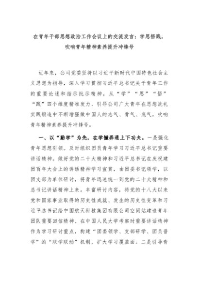 【七哥公文】2024年:在青年干部思想政治工作会议上的交流发言:学思悟践,吹响青年精神素养提升冲锋号+更多免费公文+VX:QiGeGongWen2024
