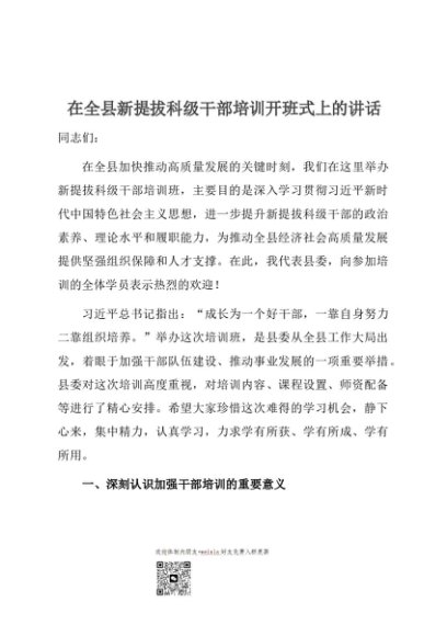 / 【七哥公文】2024年:在全县新提拔科级干部培训开班式上的讲话+更多免费公文+VX:QiGeGongWen2024