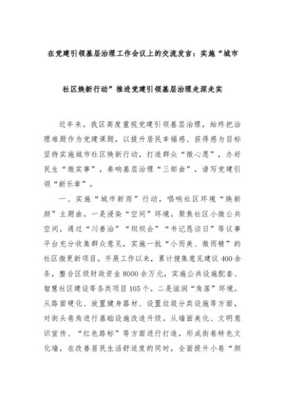 【七哥公文】2024年:在党建引领基层治理工作会议上的交流发言:实施“城市社区焕新行动”推进党建引领基层治理走深走实+更多免费公文+VX:QiGeGongWen2024