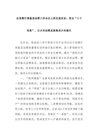 【七哥公文】2024年:在党建引领基层治理工作会议上的交流发言:突出“三个有效”,以乡村治理成效推进乡村振兴+更多免费公文+VX:QiGeGongWen2024