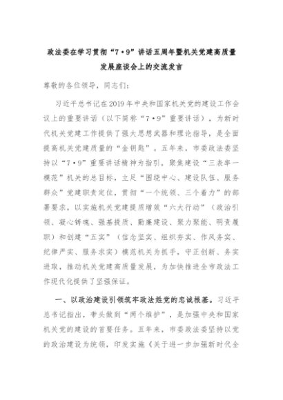 【七哥公文】2024年:政法委在学习贯彻“7·9”讲话五周年暨机关党建高质量发展座谈会上的交流发言+更多免费公文+VX:QiGeGongWen2024