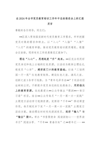 【七哥公文】2024年:在2024年全市党员教育培训工作年中总结推进会上的汇报发言+更多免费公文+VX:QiGeGongWen2024