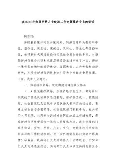 【七哥公文】2024年:在2024年加强网络人士统战工作专题推进会上的讲话+更多免费公文+VX:QiGeGongWen2024