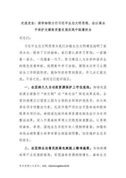 【七哥公文】2024年:交流发言:深学细悟力行习近平生态文明思想,在以高水平保护支撑高质量发展实践中挺膺担当+更多免费公文+VX:QiGeGongWen2024