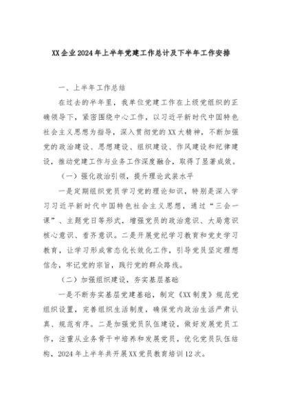 【七哥公文】2024年:XX企业2024年上半年党建工作总计及下半年工作安排+更多免费公文+VX:QiGeGongWen2024