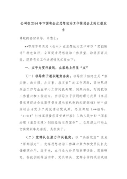 【七哥公文】2024年:公司在2024年市国有企业思想政治工作推进会上的汇报发言+更多免费公文+VX:QiGeGongWen2024