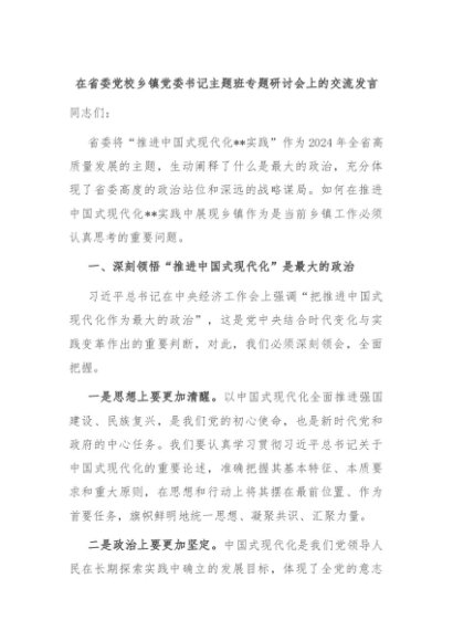 【七哥公文】2024年:在省委党校乡镇党委书记主题班专题研讨会上的交流发言+更多免费公文+VX:QiGeGongWen2024