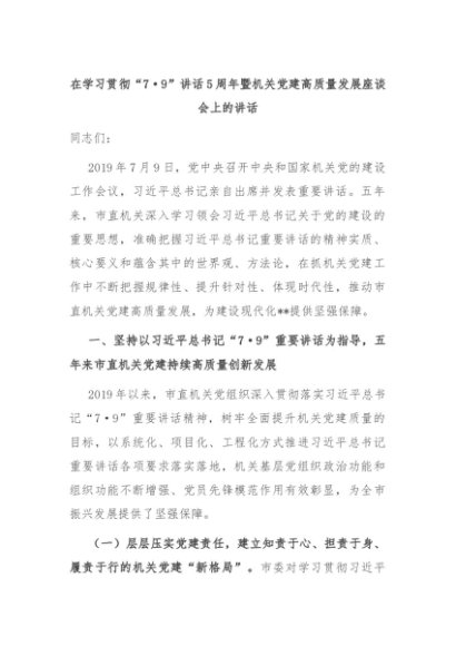 【七哥公文】2024年:在学习贯彻“7·9”讲话5周年暨机关党建高质量发展座谈会上的讲话+更多免费公文+VX:QiGeGongWen2024