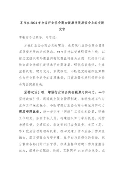 【七哥公文】2024年:某市在2024年全省行业协会商会健康发展座谈会上的交流发言+更多免费公文+VX:QiGeGongWen2024