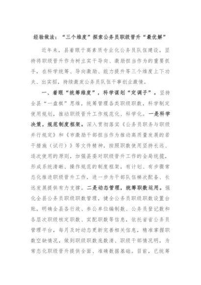 【七哥公文】2024年:经验做法:“三个维度”探索公务员职级晋升“最优解”+更多免费公文+VX:QiGeGongWen2024