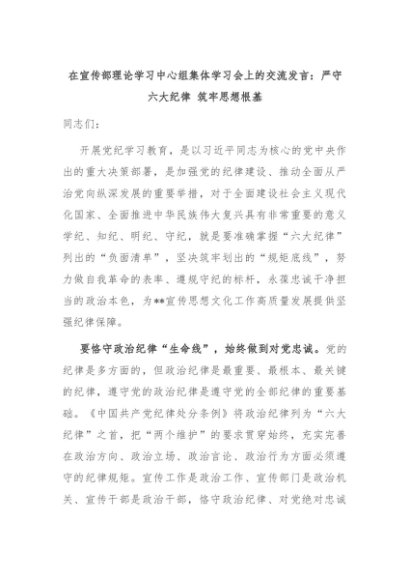 【七哥公文】2024年:在宣传部理论学习中心组集体学习会上的交流发言:严守六大纪律 筑牢思想根基+更多免费公文+VX:QiGeGongWen2024