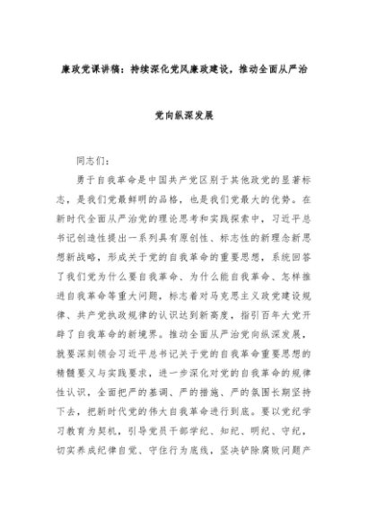 【七哥公文】2024年:廉政党课讲稿:持续深化党风廉政建设,推动全面从严治党向纵深发展+更多免费公文+VX:QiGeGongWen2024
