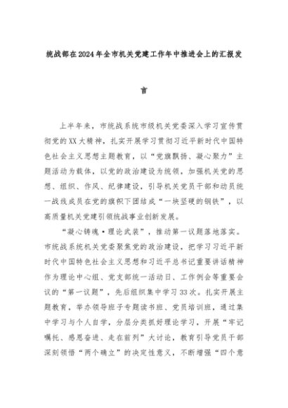 【七哥公文】2024年:统战部在2024年全市机关党建工作年中推进会上的汇报发言+更多免费公文+VX:QiGeGongWen2024
