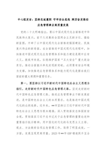 【七哥公文】2024年:中心组发言:坚持忠诚履职 守牢安全底线 踔厉奋发推动应急管理事业高质量发展+更多免费公文+VX:QiGeGongWen2024