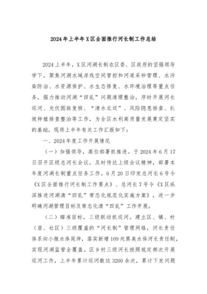 / 【七哥公文】2024年:2024年上半年X区全面推行河长制工作总结+更多免费公文+VX:QiGeGongWen2024