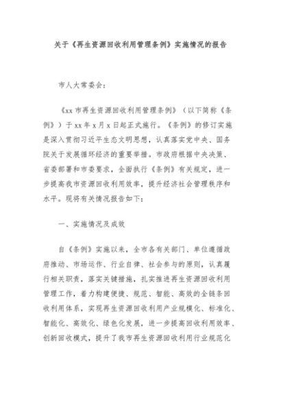 / 【七哥公文】2024年:关于《再生资源回收利用管理条例》实施情况的报告+更多免费公文+VX:QiGeGongWen2024
