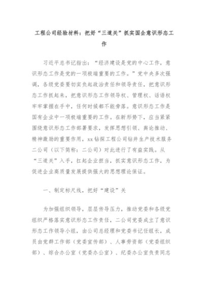 【七哥公文】2024年:工程公司经验材料:把好“三道关”抓实国企意识形态工作+更多免费公文+VX:QiGeGongWen2024