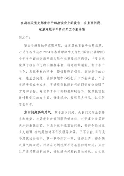 【七哥公文】2024年:在局机关党支部青年干部座谈会上的发言:在直面问题、破解难题中不断打开工作新局面+更多免费公文+VX:QiGeGongWen2024