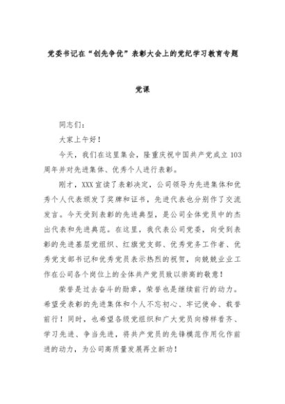 【七哥公文】2024年:党委书记在“创先争优”表彰大会上的党纪学习教育专题党课+更多免费公文+VX:QiGeGongWen2024