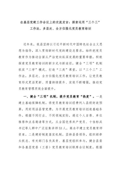 【七哥公文】2024年:在基层党建工作会议上的交流发言:探索运用“三个三”工作法,多层次、全方位强化党员教育培训+更多免费公文+VX:QiGeGongWen2024