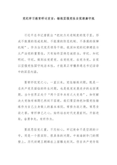 / 【七哥公文】2024年:党纪学习教育研讨发言:锤炼坚强党性自觉清廉守规+更多免费公文+VX:QiGeGongWen2024