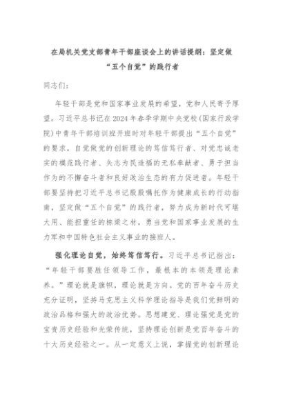 【七哥公文】2024年:在局机关党支部青年干部座谈会上的讲话提纲:坚定做“五个自觉”的践行者+更多免费公文+VX:QiGeGongWen2024