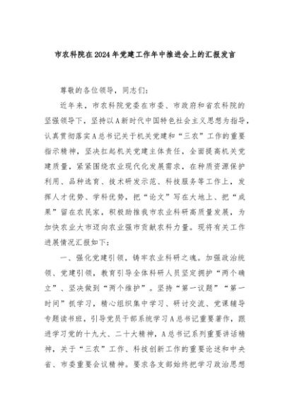【七哥公文】2024年:市农科院在2024年党建工作年中推进会上的汇报发言+更多免费公文+VX:QiGeGongWen2024