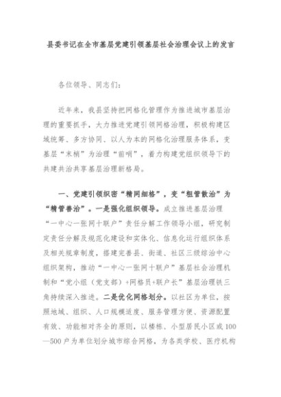 【七哥公文】2024年:县委书记在全市基层党建引领基层社会治理会议上的发言+更多免费公文+VX:QiGeGongWen2024