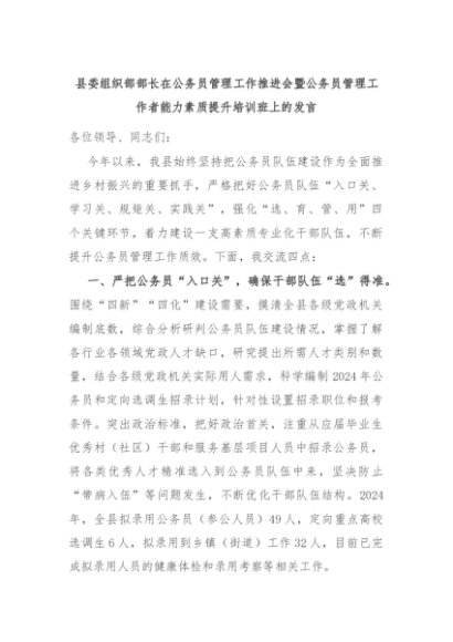 【七哥公文】2024年:县委组织部部长在公务员管理工作推进会暨公务员管理工作者能力素质提升培训班上的发言+更多免费公文+VX:QiGeGongWen2024