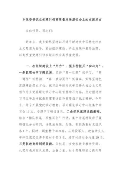 / 【七哥公文】2024年:乡党委书记在党建引领高质量发展座谈会上的交流发言+更多免费公文+VX:QiGeGongWen2024