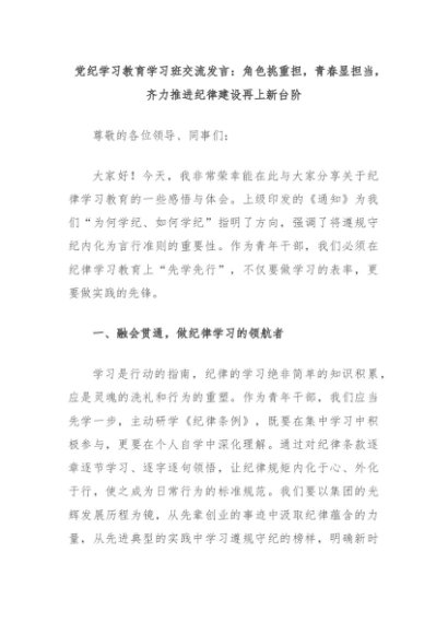 【七哥公文】2024年:党纪学习教育学习班交流发言:角色挑重担,青春显担当,齐力推进纪律建设再上新台阶+更多免费公文+VX:QiGeGongWen2024