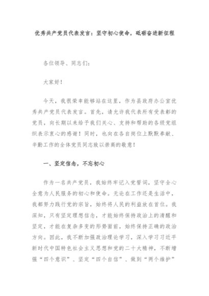 【七哥公文】2024年:优秀共产党员代表发言:坚守初心使命,砥砺奋进新征程+更多免费公文+VX:QiGeGongWen2024