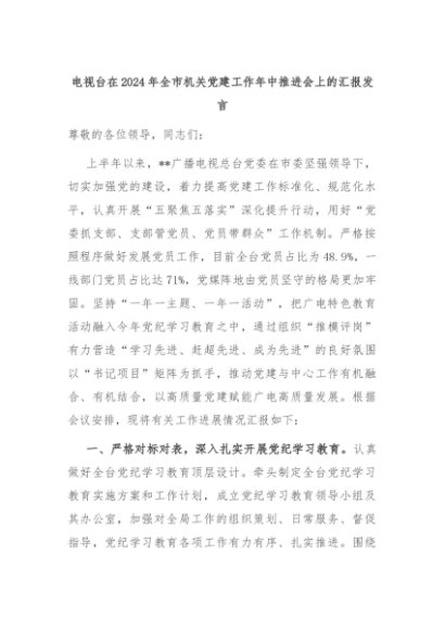 【七哥公文】2024年:电视台在2024年全市机关党建工作年中推进会上的汇报发言+更多免费公文+VX:QiGeGongWen2024