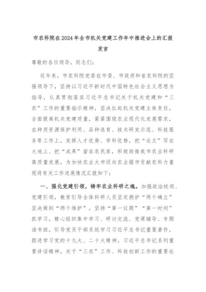 【七哥公文】2024年:市农科院在2024年全市机关党建工作年中推进会上的汇报发言+更多免费公文+VX:QiGeGongWen2024